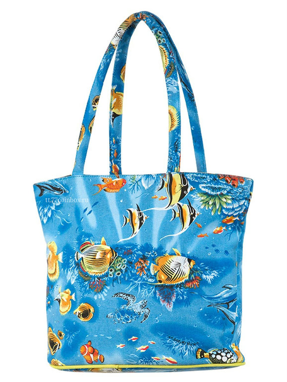 №90050. СУМКА ПЛЯЖНАЯ - 275р. Стильная и компактная сумка с двумя ручками кручёного типа. Модель дополнена застёжкой-молнией, контрастной окантовкой по дну и внутренним карманом, закрывающимся на молнию. Размер: 35*26*15cm Состав: 100% хлопок - верх, рисунок - ПВХ Цвет: принт рыбки