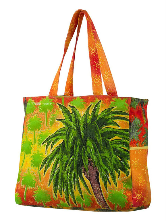 №90034. СУМКА ПЛЯЖНАЯ - 575р. Объёмная женская сумка с двумя удобными ручками и молнией, украшенной подвеской-пальмой. Модель дополнена открытыми боковыми карманами с яркими кантами и практичным внутренним карманом на молнии. Размер 46*39*14cm Состав: 100% хлопок - верх, рисунок - ПВХ Цвет: оранжевый/принт пальма