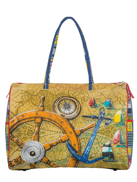 №90043. СУМКА ПЛЯЖНАЯ - 575р. Объёмная летняя сумка с двумя ручками кручёного типа и застёжкой-молнией, украшенной подвеской-корабликом. Модель дополнена боковыми карманами с контрастной окантовкой и потайным карманом на молнии. Пластмассовые «ножки» служат для защиты дна от повреждений. Размер: 50*36.5*20cm Состав: 100% хлопок - верх, рисунок - ПВХ Цвет: принт большое путешествие