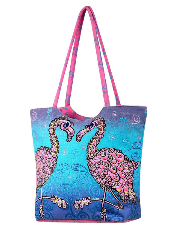№90045. СУМКА ПЛЯЖНАЯ - 505р. Объёмная летняя сумка с двумя ручками кручёного типа и застёжкой-молнией, украшенной подвеской-фламинго. Модель дополнена внутренним потайным карманом, закрывающимся на молнию. Размер: 46*37*18cm Состав: 100% хлопок - верх, рисунок - ПВХ Цвет: принт фламинго