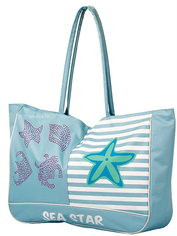 Объёмная летняя сумка с двумя широкими присборенными ручками на петлях-шнурах. Застёжка-молния украшена подвеской-морской звездой. Важное дополнение - удобный внутренний карман, закрывающийся на молнию.