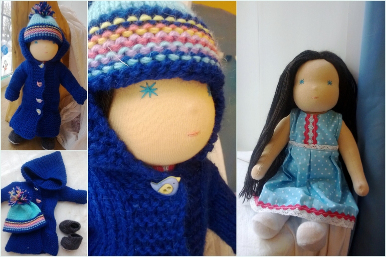 Как всегда сшита полностью из натуральных материалов по традиционной вальдорфской технологии из хлопкового трикотажа, набивка - овечья шерсть, для волос используется шерстяная пряжа. Волосы вшиты равномерно по всей голове, их можно расчесывать и делать разные прически. Ручки и ножки двигаются свободно во все стороны . Одежда - платье, панталончики, туфельки, колготки, шапочка и пальто - полностью снимается.