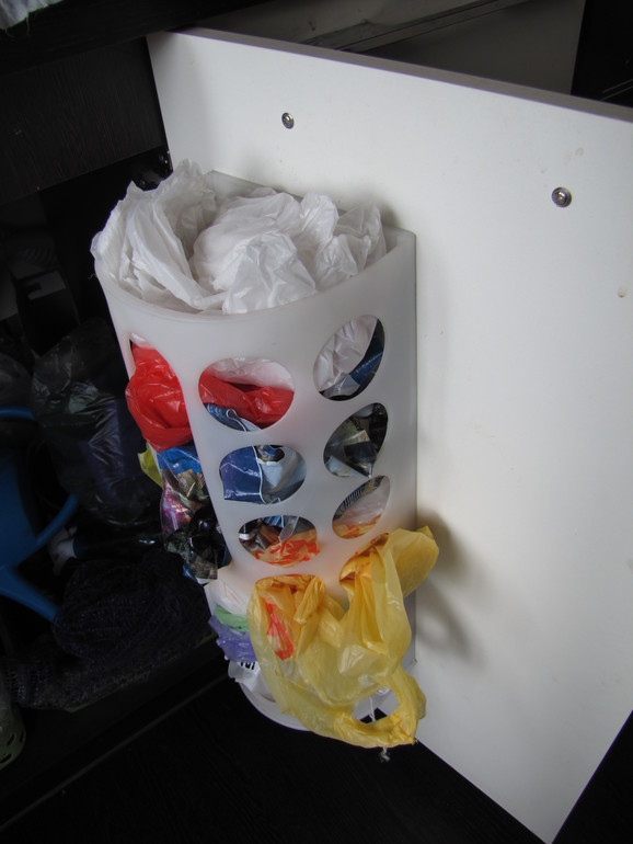 Сделайте ревизию пакетов (если они у вас есть и там хранятся, зачем их столько?!). Для покупок удобнее использовать матерчатые сумки (или для больших покупок, типа лентовских или из мЕтро). Кстати п/леновые пакеты удобно хранить в такой штуке (покупала в икее за копейки!):