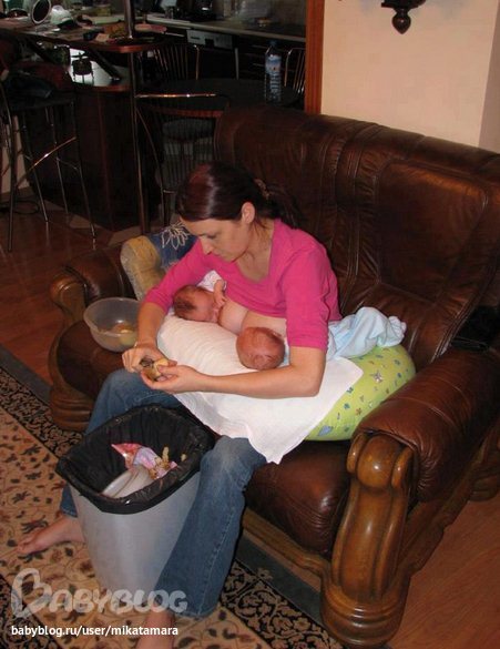 Кормить двоих одновременно мне неудобно - один быстро наедается, а второй долго сосет с перерывами на отдых. Часто бывает так: кормишь одного, наслаждаешься близостью, тут вдруг второй просыпается и орет. Что делать? Выдергивать сисю изо рта бедного ребенка и бежать ко второму или продолжать кормить и вынуждать одного орать, а второго слушать эти крики? Тем более, что если один кричит, то второй тоже начинает сочувственно плакать.