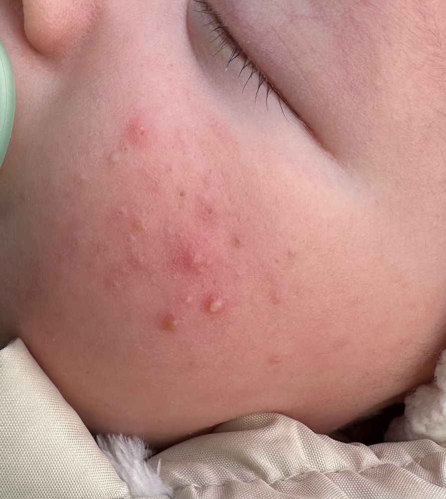 Девочки, примерно где то с 2 недель, начались такие высыпания и черные точки, как думаете это акне новорожеденных?щас ребенку уже почти 3 месяца ,никак не проходят