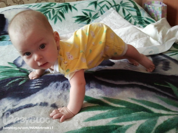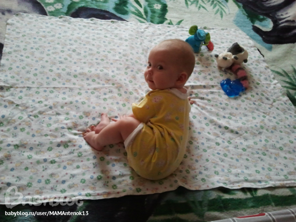 - из положения на корачках садится на попу :) спинку еще держать не может, т.ч получается что нагрузки нет на позвоночник;
