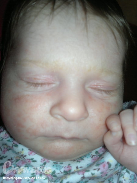 с щечек красными пятнами с белыми головками,теперь по всему лицу(кожа стала сухая чуть ли не коркой берется) и стало по телу проявляться...