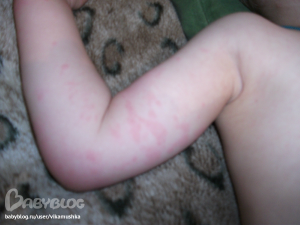 Посмотрите,может кто-то встречался....Высыпания вот такими пятнами,как-будто крапивой прошлись по телу.....Высыпания на ногах,руках,попе и на щеках....На спине и на животе нету ничего.И это все чешется временами,не постоянно.Нового ничего не ел,только пшикала вчера и сегодня горло детским орасептом.Могла на него быть аллергия?