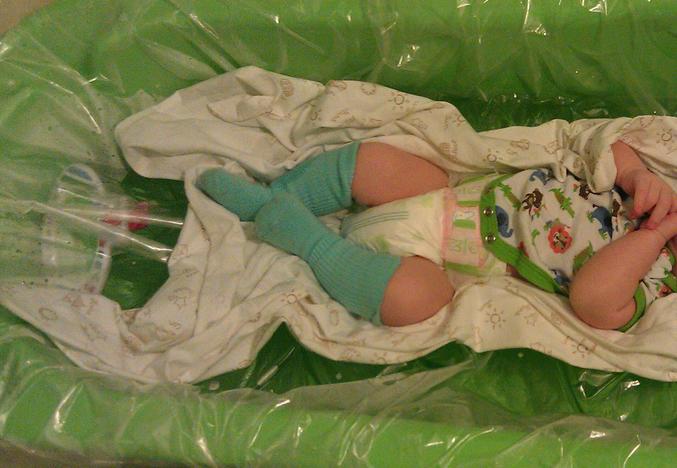 Воду в ванночку наполовину, темпа как для купания, пленку прям по поверхности, плотно прилегая по краям, сверху пеленку и малыша.