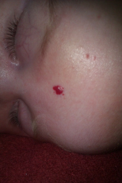 опять она-гемангиома! Вот Сегодня прижгли. Три маленьких пятнышка. Бедная моя