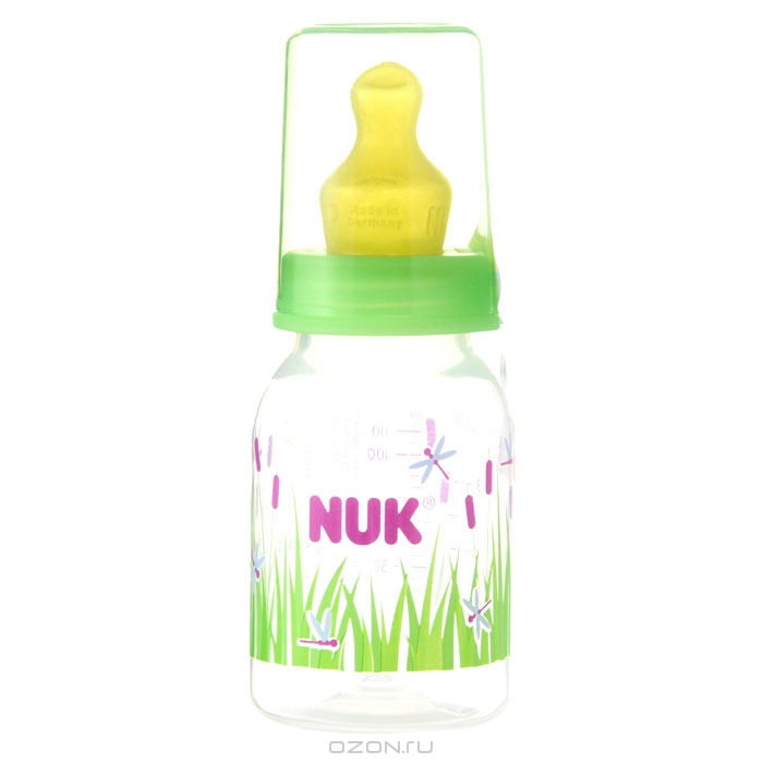 125 мл,я свою почти 5-ти месячную еще с неё кормлю. Что поделать если больше не съедает.У нас прекрасная бутылочка из стекла фирмы NUK с резиновой соской. Измерительная шкала не стирается(как с пластмассовых) и соску мягкая,не как силикон.У "Нук" их много,у нас вот такая: (соска очь хорошая)