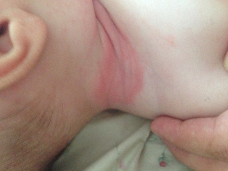 Жарко, преет шея, почаще мыть и намазать на ночь чем-нибудь от опрелостей, я бепантеном мазала, только совсем чуть чуть