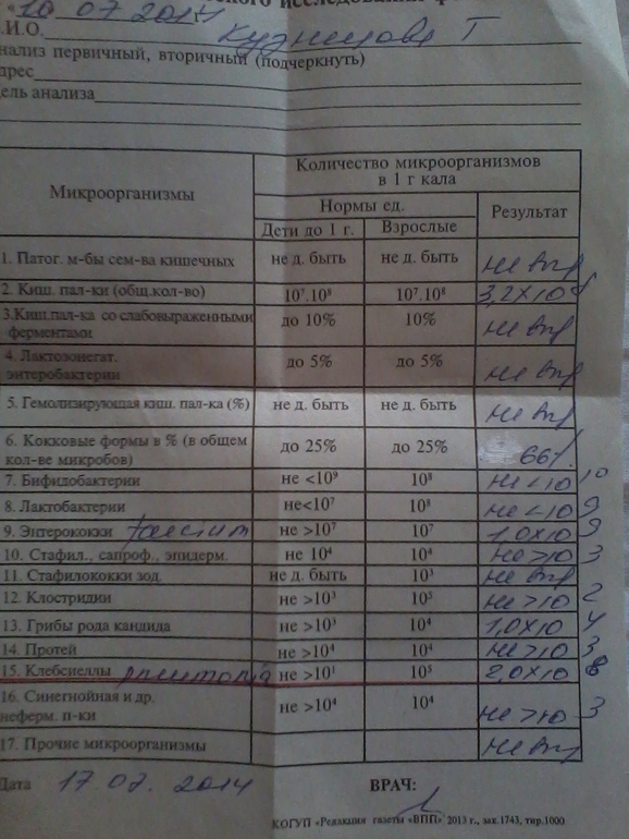 Мы с рождения и до 8 месяцев мучались животом,были боли сильные и жидкий стул,ребенок плохо прибовлял и отказывалась есть.Был сначало стафилакок,вфлечили бактериофагом,потом дала пюрешку агуша и сама сьела в итоге вдвоем отравились,был жуткий понос по несколько раз в день и долго не могли остановить,около недели,в итоге клибсиелла,ее лечили энтерофурилом,потом энтерол,и при этом еще пили бифидумбактерин,потом аципол,сейчас тьфу тьфу,стул хотябы наладился и ребенок начал кушать.Если кроху не мучает живот я бы даже и не стала обращать внимание на анализ,единственное врач говорит когда у нас слизь в стуле попить бактерии,единственное что нам не подходит так это линекс,дороговат,а толку не какого))Мы с нашим животом очень много врачей поменяли,никто не хотел лечить,т.к этого диагноза нет, но никого не волновало что ребенок плохо себя чувствует(Не болейте,попейти бактерии они не навредят,если конечно аллергии нет на лактозу!))