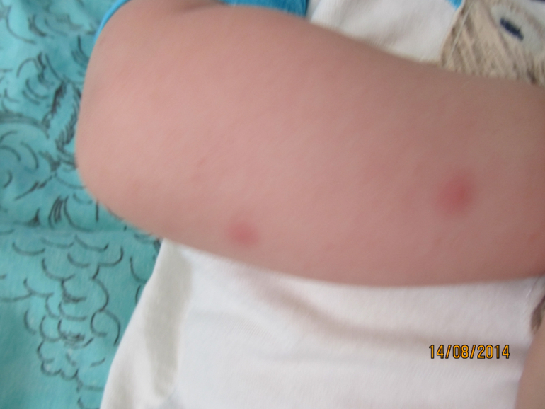 Высыпания на кожеУ ребенка по телу появились красные пятна(фото под катом), похожие на комариные укусы,один даже нагноился на щечке,врач сказала прижечь их все зеленкой,прижгла,стали вроде проходить и уменьшились,новых не появлялось,на ночь включаем средство от комаров,вчера тоже включали,а сегодня днем обнаружила 2 новых пятна на ручке(жаль что утром не осмотрела,и не могу теперь понять с ночи они или появились днем)а на ножке вместо одного стало 3....вот и думаю теперь,может это и не укусы насекомого вовсе? прошу прощения за качество фото,ребенок никак не желал фоткаться(((