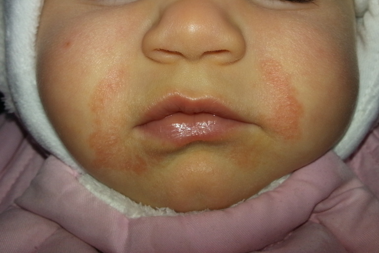 На первый взгляд, очень похоже на раздражение от соски и обильного слюноотделения. Попробуйте обрабатывать отваром ромашки, хуже точно не будет, а вот зуд можете снять. Еще гляньте лекцию ссылка, там врач объясняет, что делать если на коже ребенка появились покраснения или сыпь, как отличить потничку, диатез, цветение и другие "прелести" друг от друга и как не допустить высыпаний.