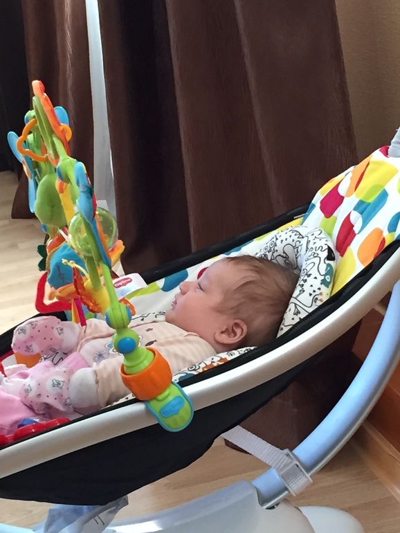 Спасибо! ой, качели мое спасение! У груди не постоянно, может по долгу лежать и мобиль смотреть или на качельках, ночью тоже неплохо спит