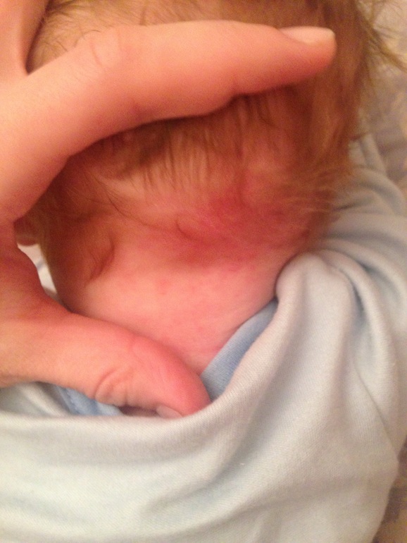 Это не проявляется сразу, тк поначалу даже шеи как таковой-нет))) Говорю, потому что все что Вам тут написали-реально бред! Про пот и т.п.У нас то же было... И на веке, и на шее. Как раз к полутора все и прошло! Не переживайте, смазывать ничем не надо — все бестолку, это сосуды! Кремом смысла нет)))