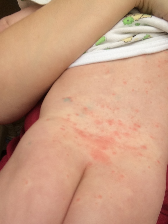 у нас началось все с поясницы- где подгузник был, потом выше все поднялось, есть и на лопатках и на шее и на плечах, сейчас лежала на животе терлась, — так и на животе появилось немного((