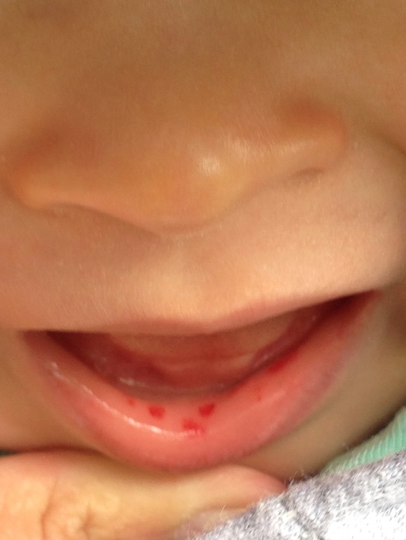 у нас одна такая точка род губой вскочила, я подумала, что малышка чем то поранилась (всё в рот тащит), прошло само за два дня...