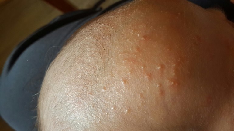 Сегодня состояние такое - на щеках эти прыщики подсохли и покрылись корочкой. Щеки жутко шершавые, при этом новые прыщи все появляются, их стало больше и на голове. Единичные есть вверху грудки и спинки, чуть на ушах. Все тело чистое.