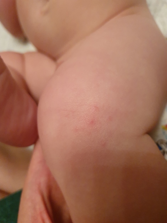 Были обычно пятна красные один два, раздельно, на лице и теле. А тут дала банобаночный кабачок и на следующий день на коленке небольшая краснота и скопление прыщей.