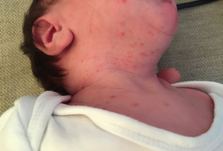 Высыпания на кожеДобрый день! У нас вот такие высыпания, мы на ГВ. Нам 17 дней. Из пищи все аллергены исключены, личико и все складочки регулярно протираем ватным диском с водичкой. Подскажите, что это иожет быть такое?