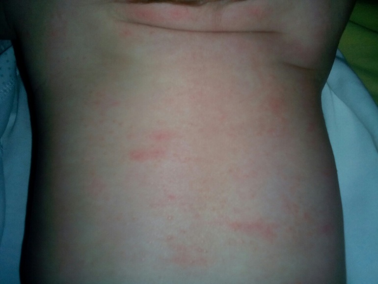 На ночь и сегодня утром дала фенистил,спали голышом,вечером правда вспотела во время еды,но мокрую кофточку я сразу сняла!Сегодня к вечеру такая картина:краснота сошла,вчерашние прыщи подсохли,но за день вылезло куча новых белых((( Завтра пойду к врачу,но у нее это будет 1000% алергия,у нее и акне алергией было и даже скарлатина( Фото сегодня под кат