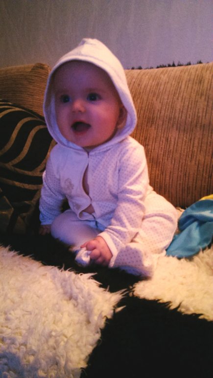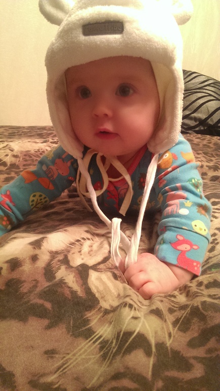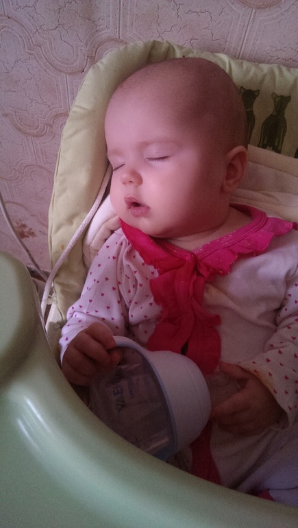 Сама пока никак,но видно что старается. Поднимаю за ручки - она садится.