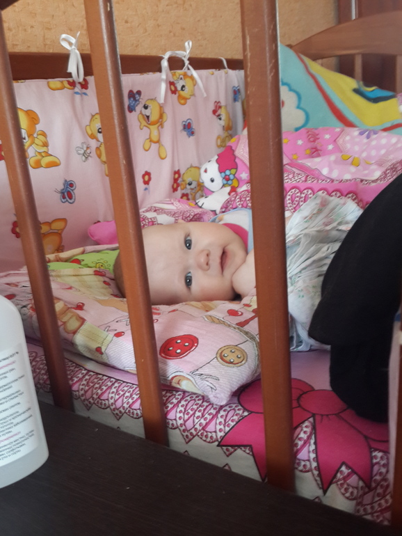 Моя гулит, даёт понять, что проснулась. А как подойду к кроватке, улыбается.