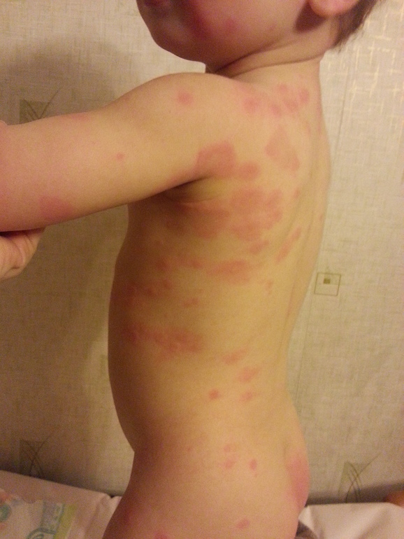 К вечеру сыпь усилилась, начала сливаться. Я позвонила своему знакомому педиатру, он сказал, чтобы следили за сыпью на лице и главное - за дыханием: если не дай Бог послышаться хоть еле уловимые хрипы - сразу скорую.