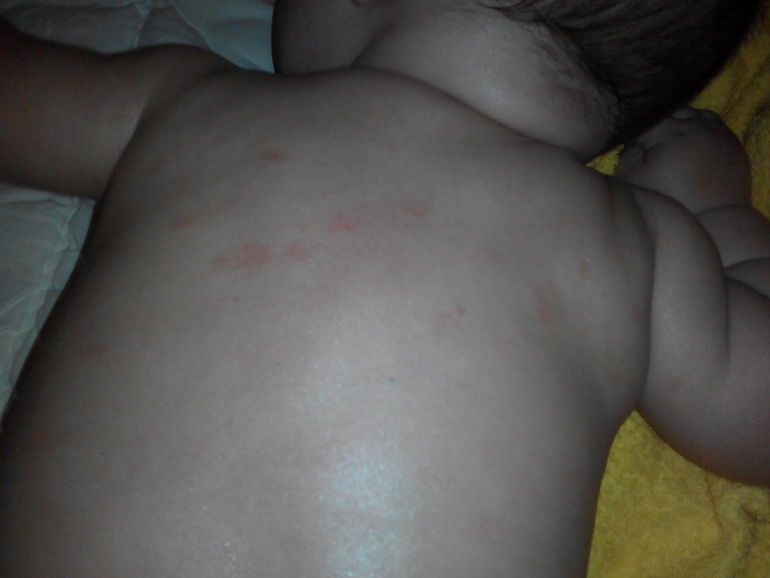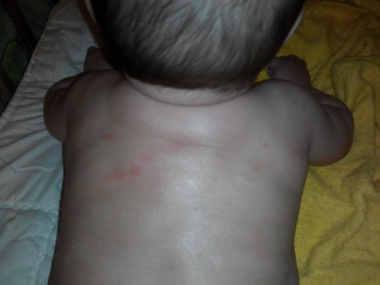 У нас вначале и на животе было, как кожа потертая, но уже нет, а вот на спинке есть. Утром их почти не видно.