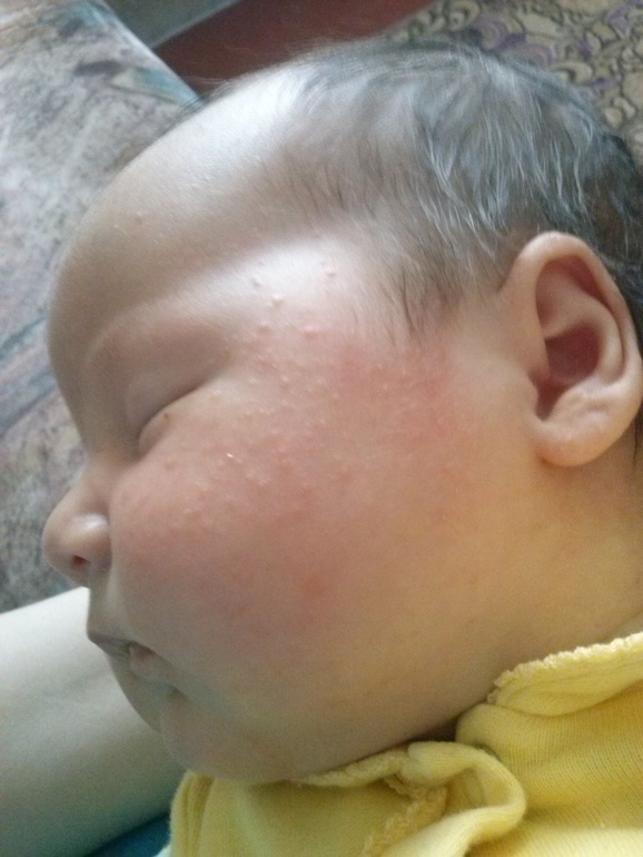 это утреннее фото, сейчас спустя часа 4-6 остались только прыщички, беленькие, а краснота прошла.... не знаю...