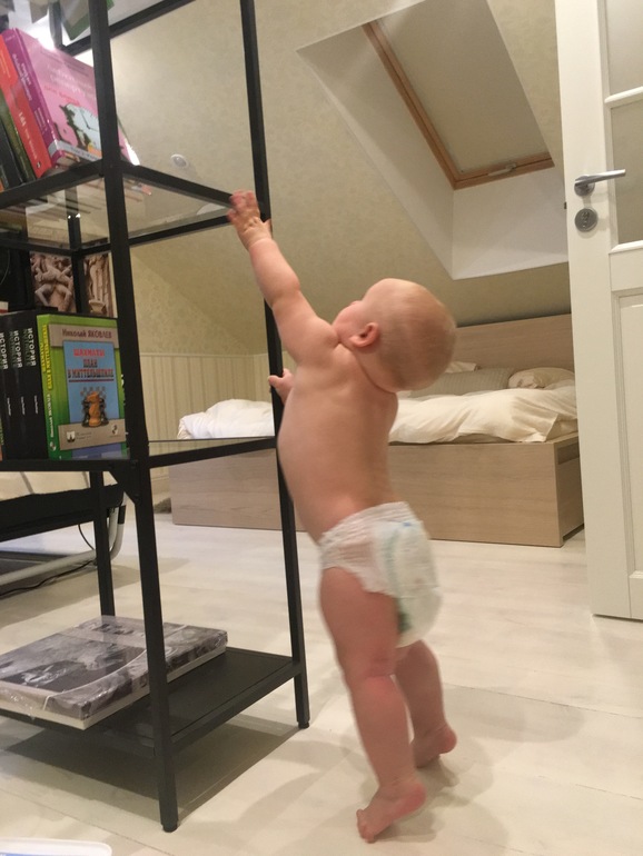 Очень активен, на месте не сидит совсем, только бегает на карачках.