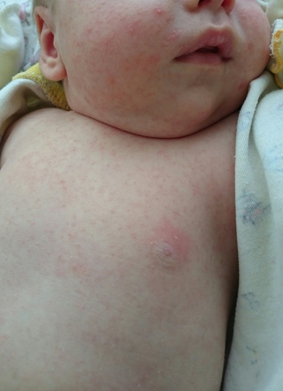 АллергияДобрый день,девочки!Опять мы со своей сыпью,которая уже далеко не акне. Вобщем распространилась эта бяка по всему телу,при чем на теле выглядит как натуральная потница,розовые невыпуклые точечки,кожа при этом гладкая.Обсыпало все,грудь спину руки ноги шею...И что примечательно, когда ребёнок спит(т.е в спокойном состоянии) сыпи нет...не видно...стоит начать кривляться и кричать- снова проявляется во всей красе...были у врача,сказали либо потница(что вероятно) либо аллергия,предложили помыть реьенка с мылом и смотреть на следующий день....это было 30 августа...сыпь естественно не прошла и даже не побледнела,аллергия?сижу на строгой диете,НО накануне 29 числа на дне рождения съела небольшой кусок торта.....но даже если это реакция на него,то должно же проходить уже? помогите... Не знаю уже что делать.....на 7 записались к другому врачу...если не пройдёт.. Фото прилагаю