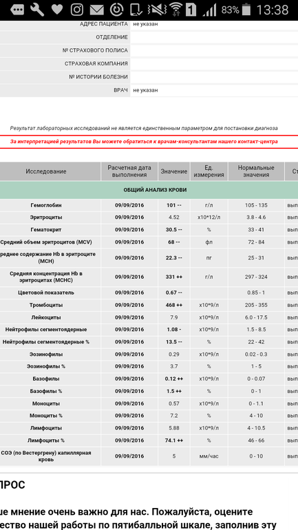 Про гемоглобин выше - не соглашусь! Он низковат. Лейкоциты норма до 10,0 тыс. Тромбоциты я уже написала. Можно в динамике посмотреть. Плюс лечение анемии.