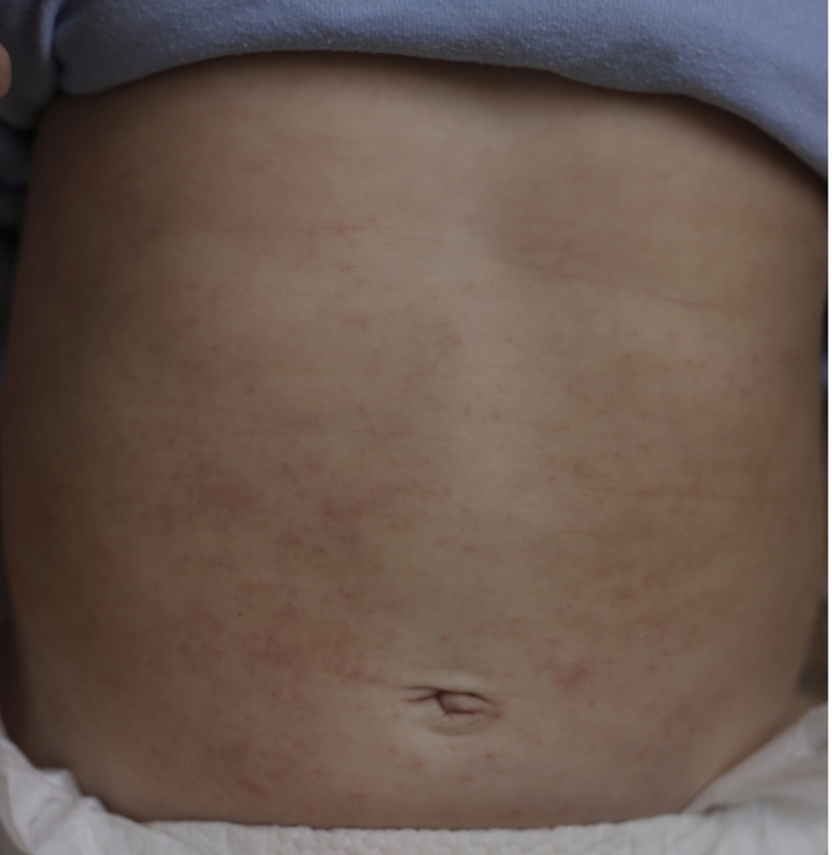Однако спустя 10-12 часов после снижения температуры у малыша появляется мелкая розовая сыпь, как при краснухе, в основном на животе, спине и шее.
