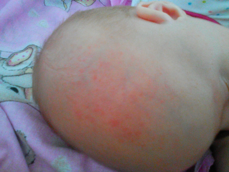 А если высыпания без гнойничков, просто красная сыпь, да еще и на красной подложке (т.е. на большом пятне маленькие высыпания) - то на аллергию похоже. Аллергеном для малыша ведь может стать всё что угодно, и молочные продукты, и приправа какая-нибудь, и фрукт.