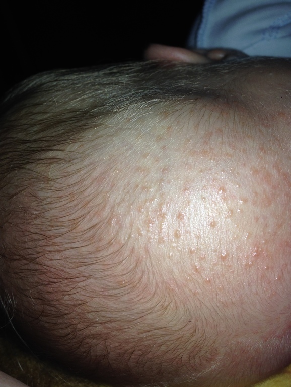 Это акне, у нас точно такие же. Протирать лаврушкой и бепантеном можно, чтоб подсыхали, но высыпать все равно будет, пока гормоны сами собой не устаканятся в организме. Может обсыпать еще уши, шею, лицо и голову. У нас высыпало в месяц, сейчас почти два, только-только стали проходить.