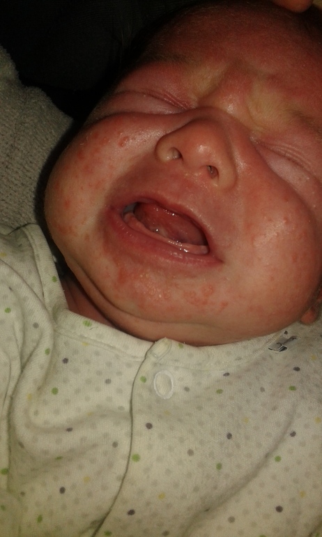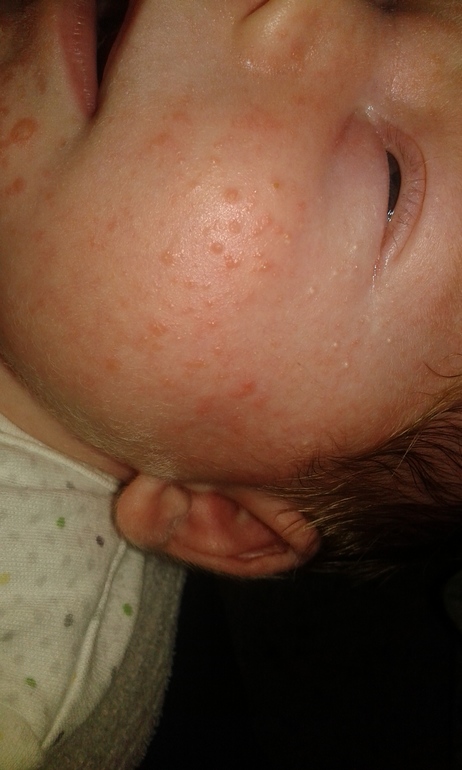Я думаю надо тебе на диету, мой покрылся похожими пупырышками (все тело с шеи до попы) после того, как я нормально поела яиц и сгущенки, прошло само через сутки-двое и акне у моего было в первый месяц жизни, но не в таких количествах конечно и на лице только.