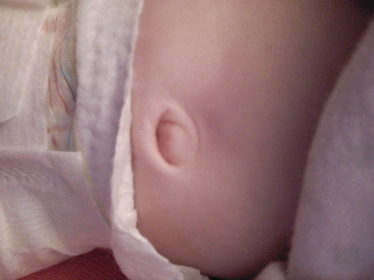 у нас вылез пупок вообще наружу. Бугром торчит и слышно там урчание, когда его обратно вправляю. А вообще я делаю просто обычную складку и заклеиваю пластырем, таким, которым в больнице пользуются. А если обычным заклеивать, то пупок не дышит и начинает мокнуть. Держу пластырь 4 дня, потом меняю. А вообще, есть спец пластырь от пупочной грыжи.