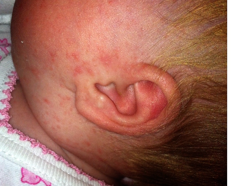 Высыпания на кожеПосмотрите, пожалуйста, что это? Это у нас на шейке, лобике. Щечки чистые и везде чисто. Нам почти 1,5 месяца