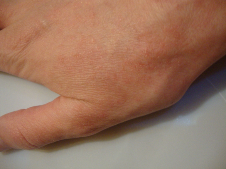 АллергияМожет кто сталкивался, гляньте пожалуйста. Не у ребенка, а у меня. Кормлю грудью, за 5,5 мес было 2 раза чуть чуть на пальце, мазала цинковой мазью - сразу проходило. А сейчас сильно на пальцах и на запястьях. Аллергии никогда в жизни не было ни на что. Как красные прыщики, не чешится, кожа очень сухая, как потресканная. Фото: