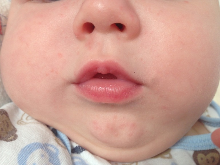 Возле рта раздражение от слюней. На носу акне. У меня у обоих так же) вернее у сына акне а у дочки на слюни)