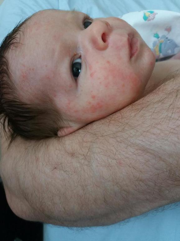 Высыпания на кожеЧерез 1,5 недели после выписки из роддома появились высыпания на подбородке, но потом, с каждым днем, распространялась сыпь и покраснения на щечки, на лоб, дальше на тело пошло, ножки, бока, сейчас плечи и даже на писюне😨 На ГВ, правда из-за сильных трещин сейчас кормлю с накладкой. Я и так была на диете (ничего аллергенного не ем), но когда появилось на боку, отменила еще говядину, творог и кедровые орешки (сейчас ем гречу, треску в фольге в духовке, брокколи и цветная капуста тушеная, индейка тушеная, редко чай заварной) - так больше недели, но малышу не лучше. Он прыщики хочет чесать, сейчас вся кожа где сыпь сухая. Сомневаюсь, что это аллергия на продукты, потому что за неделю хоть чуть должно было стать лучше.У педиатра сдали анализы кровь, моча, кал - ждем результат. Фото недельной давности, сейчас больше
