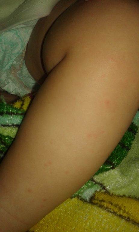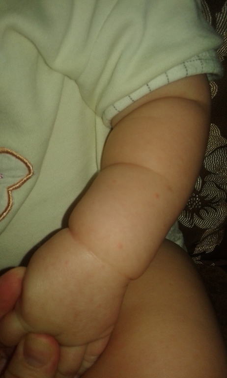 Высокая температураРебенку 7.5 мес. Вчера поднялась темп 38.8. Сбивается плохо. Даже уколом (вчера скорая приезжала), всю ночь сбивали, сироп, свечи, обтирания водой. Сегодня врач приезжала наша и сказала горло красное и зуб вот-вот второй вылезет. Сейчас её обсыпало. Ноги и руки. Чуть на теле. Аллергия? Розеола? У старшей в 7 мес была розеола, была 3 дня темп. Спала темп и высыпало всю. В том числе на голове. У младшей и сейчас темп 38.3 (2ой день). На голове нет. На теле единичные. Ниже фото