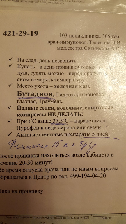 В поликленике прививки не делаю вообще. Они вечно придумают что-то. Компрессы делать недьзя, нужна мазь. У меня даже есть бумажка с подсказкой.