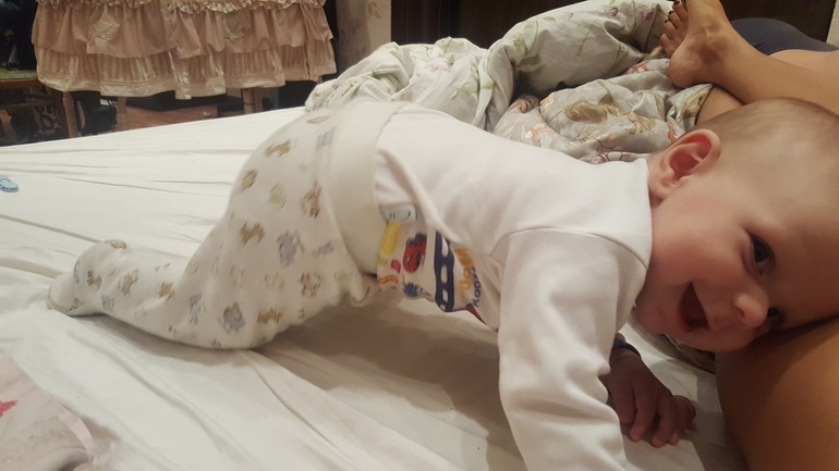 Как-то даже сел без поддержки и сидел (но случайно, так сполз с меня; я это не считаю, что сел).