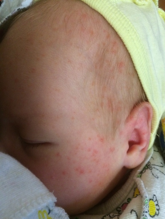 Высыпания на кожеДевочки, у малыша уже примерно неделю сыпь на лице, голове, ушах. Нам 1 мес. и 1 неделя. Сначала была только на щеках и совсем немного, последние пару дней увеличилась. Может быть на еду? Аллергенов стараюсь не есть. Если только совсем немного сыра, грецких орехов, иногда зефир, домашние овсяные печеньки (с яйцами, мукой). Сегодня из этого ничего не ела...