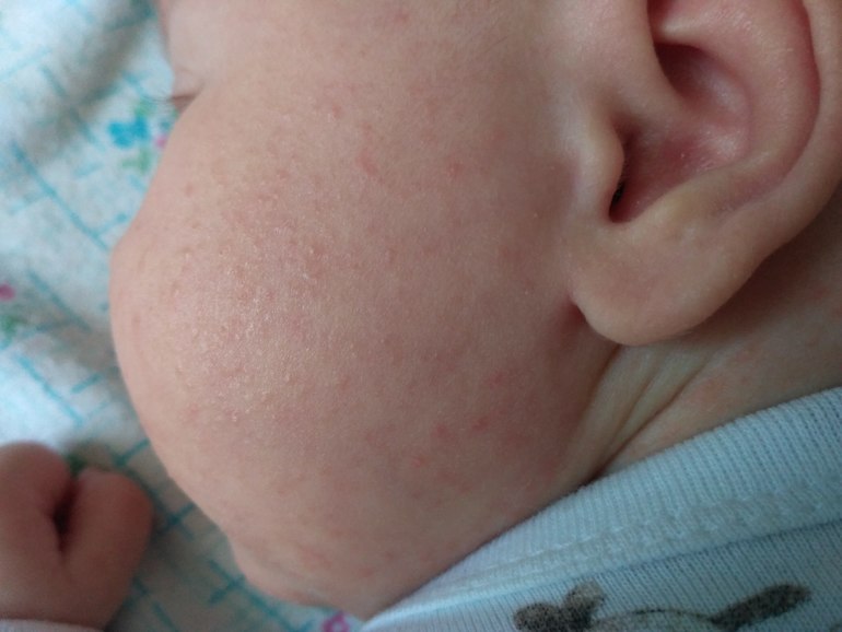 У малыша неделю назад где то обсыпало личико, а теперь сыпь добралась и до шеи и до волосистой части головы. Посмотрите пожалуйста, и скажите, это аллергия или акне новорожденных?