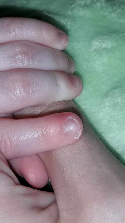 Было так у сына только на ножке,споткнулся об что-то и прям потянул угол ногтя до заусенца.воспалилось.я зеленкой помазала и все.
